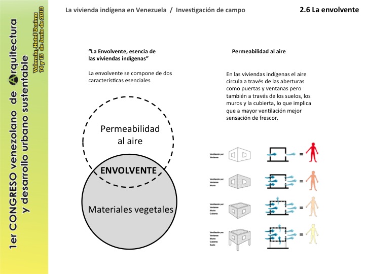 Se podría decir que la envolvente es la esencia de las viviendas indígenas y se compone de dos características esenciales: la permeabilidad al aire y los materiales vegetales de construcción. Las viviendas indígenas difieren completamente del hermetismo de las viviendas urbanas, en los cobijos indígenas el aire no solo circula a través de las aberturas como puertas y ventanas, si no también a través de los suelos, los muros y la cubierta cuyos tejidos permiten que el aire entre y salga, si hacemos una relación entre cantidad de aberturas y flujo de aire tendremos que a mayor cantidad de huecos mayor ventilación y por consecuencia mejor sensación de frescor.